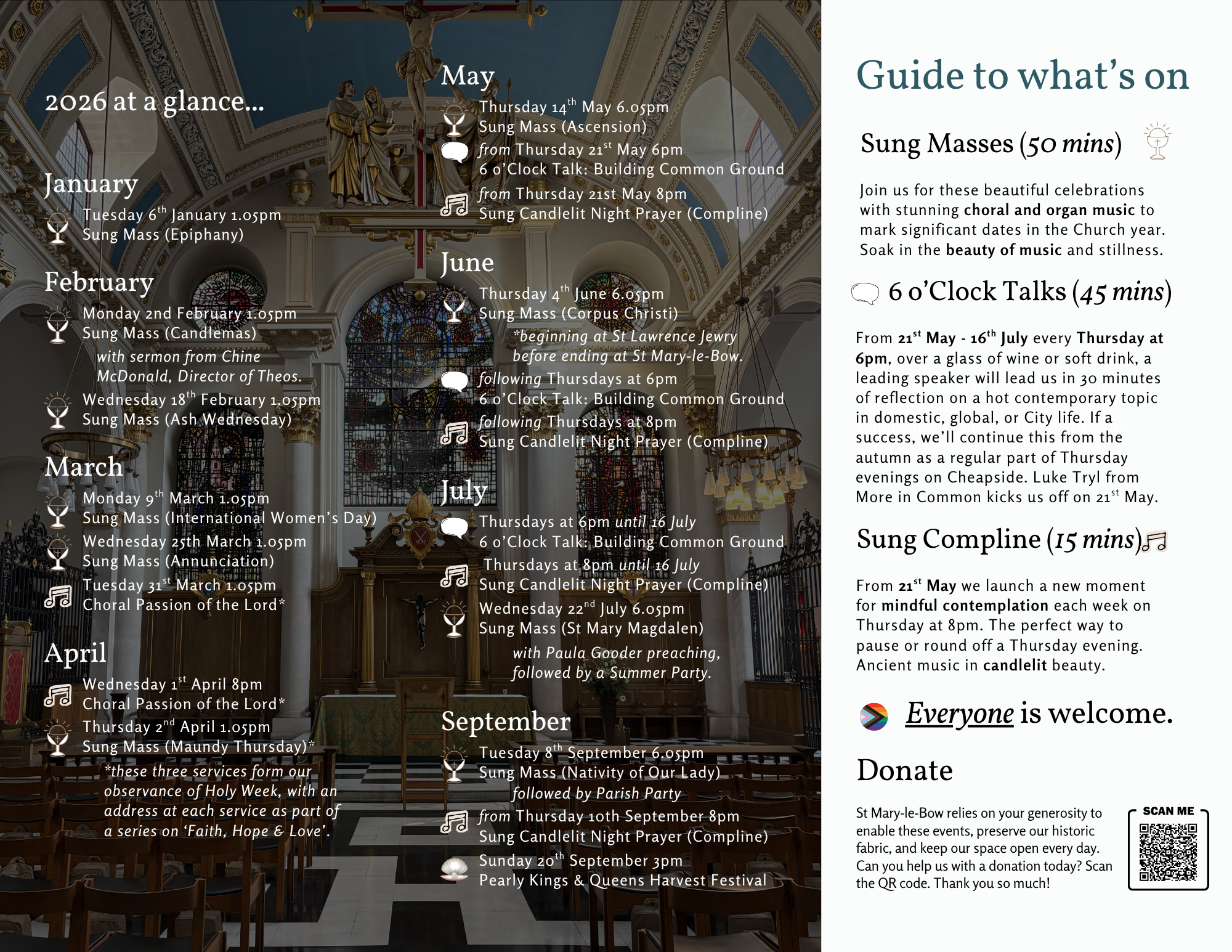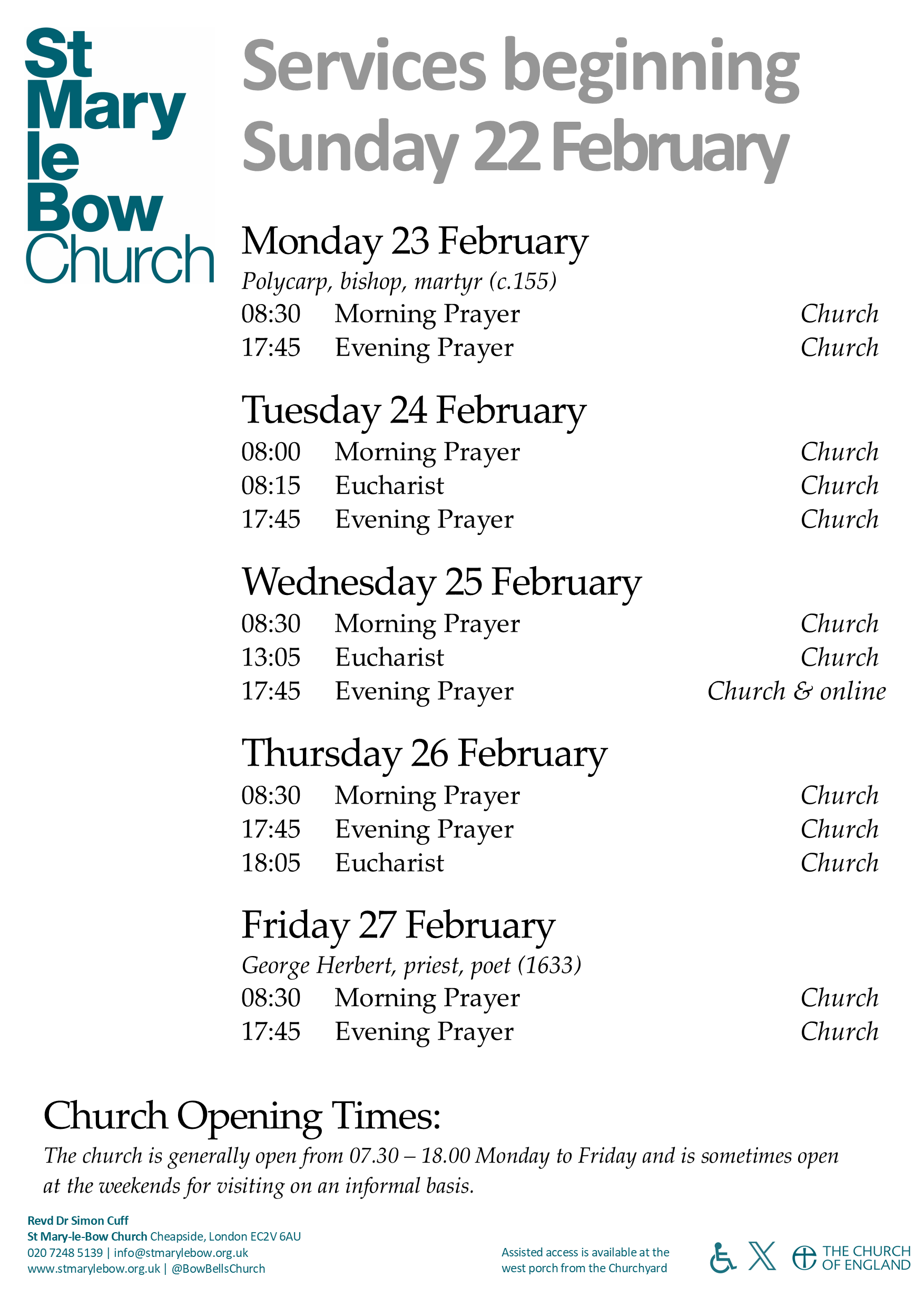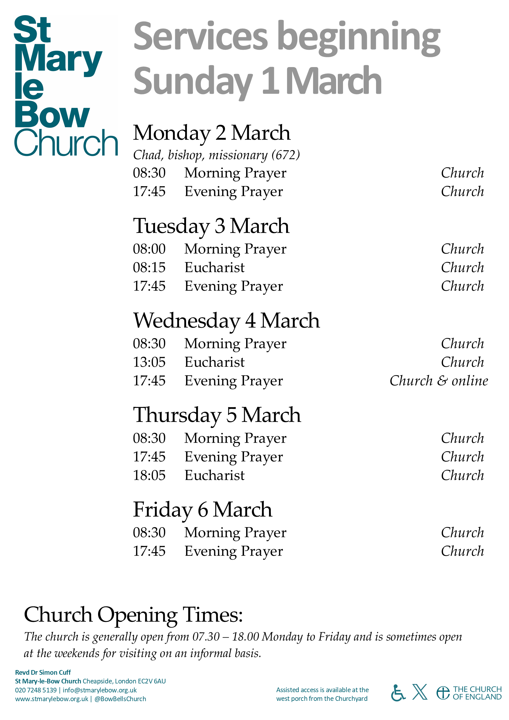 The church is usually open at the weekends for visiting on a informal basis, please check with info@stmarylebow.org.uk if necessary.